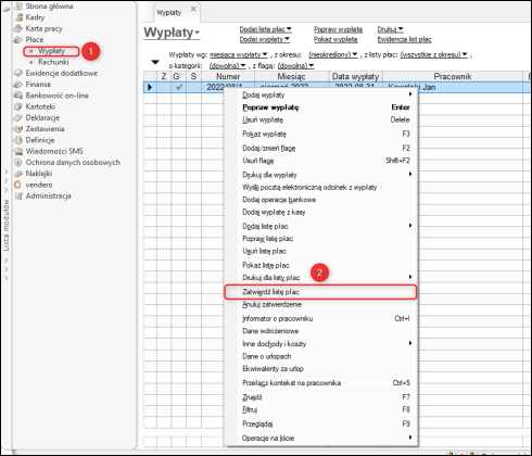 1. Przejść do modułu Płace – Wypłaty, a następnie zatwierdzić listę płac (opcja jest dostępna po kliknięciu prawym przyciskiem myszy na wypłacie).