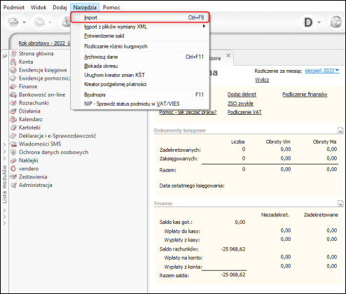 2. W programie księgowym rozwinąć górne menu Narzędzia i wybrać opcję Import.