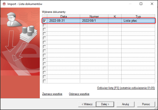 5. Zaznaczyć dokumenty, które mają zostać zaimportowane do programu księgowego i kliknąć Dalej.