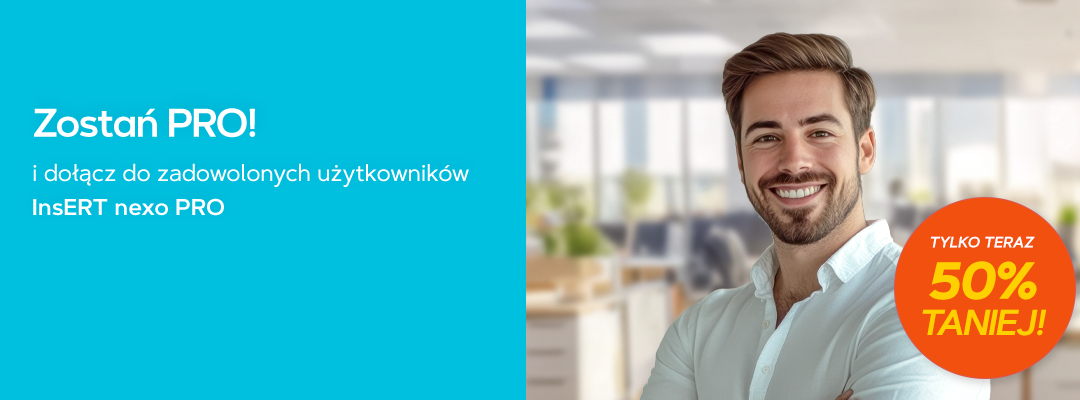 Aby kupić program InsERT nexo PRO 50% taniej, wystarczy skorzystać ze specjalnego kodu rabatowego. Rozszerzenia w promocyjnej cenie można kupować bez kodu, przez cały okres trwania promocji.