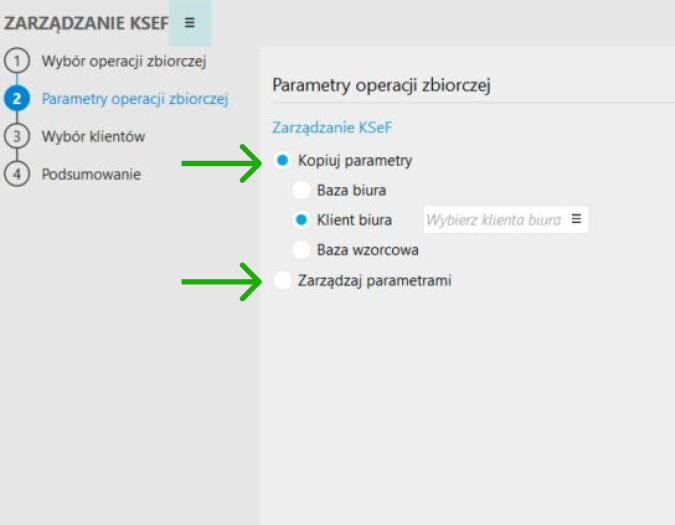 Zbiorcze zarządzanie parametrami KSeFDodano operację zbiorczą Zarządzanie KSeF, która umożliwia kopiowania parametrów ze wskazanej bazy źródłowej lub ustawienie wartości parametrów.