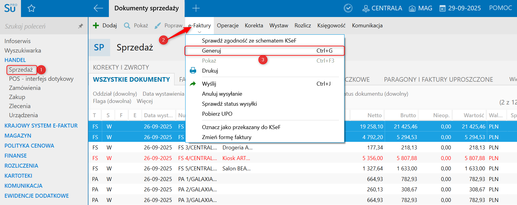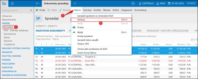 1. Przejść do modu​​łu Sprzedaż, zaznaczyć jeden lub kilka dokumentów do wysłania, następnie kliknąć górne menu e-FakturyGeneruj.