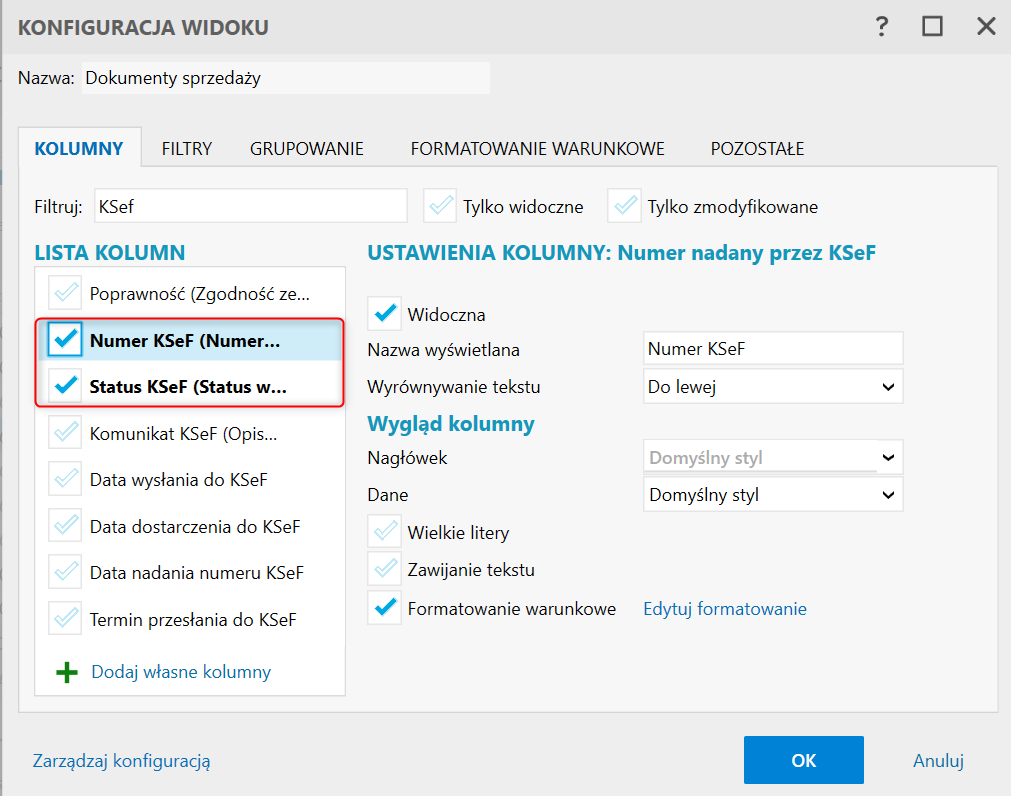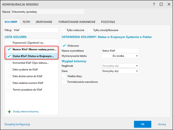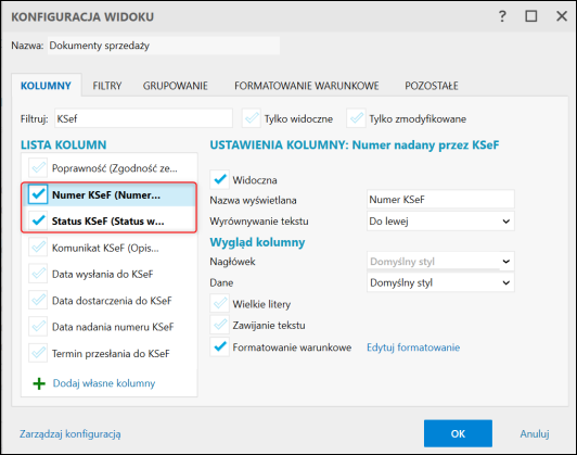 Status wysyłki oraz numer KSeF można odczytać z udostępnionyc​​​​h kolumn. Informację, jak dodać nową kolumnę można znaleźć tutaj.