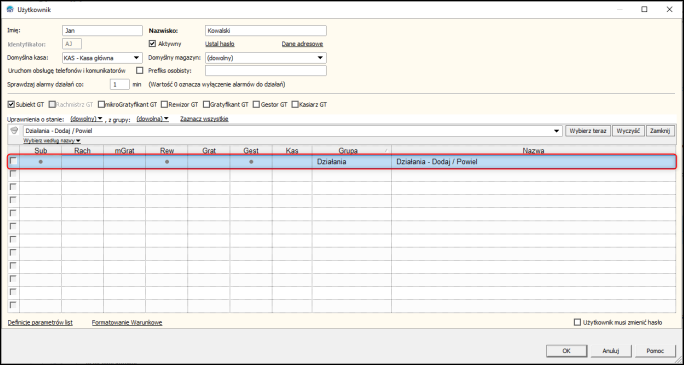 3. Na liście uprawnień odznaczyć pozycję o nazwie Działania - Dodaj / Powiel. Aby zapisać zmiany, należy wybrać OK