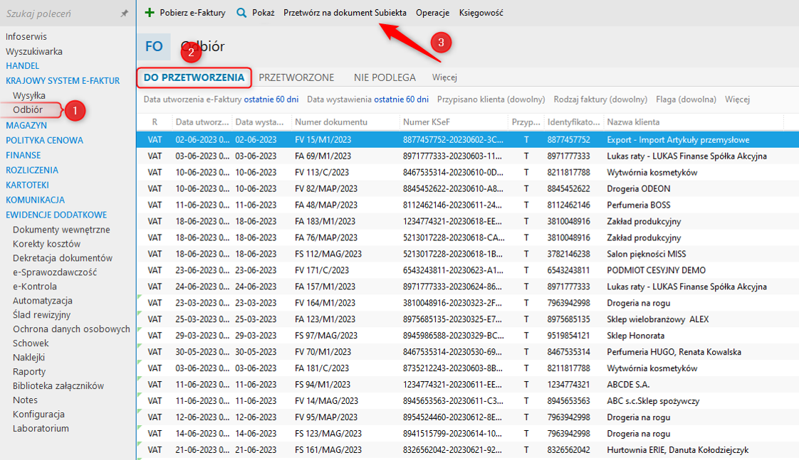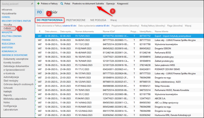 1. Przejść do modułu Krajowy System e-Faktur – Odbiór, następnie na zakładce Do przetworzenia zaznaczyć odpowiedni dokument i kliknąć Przetwórz na dokument Subiekta.
