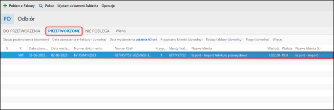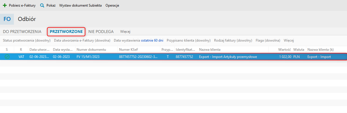 Po zapisaniu dokumentu e-Faktura zniknie z widoku Do przetworzenia i pojawi się w widoku Przetworzone.