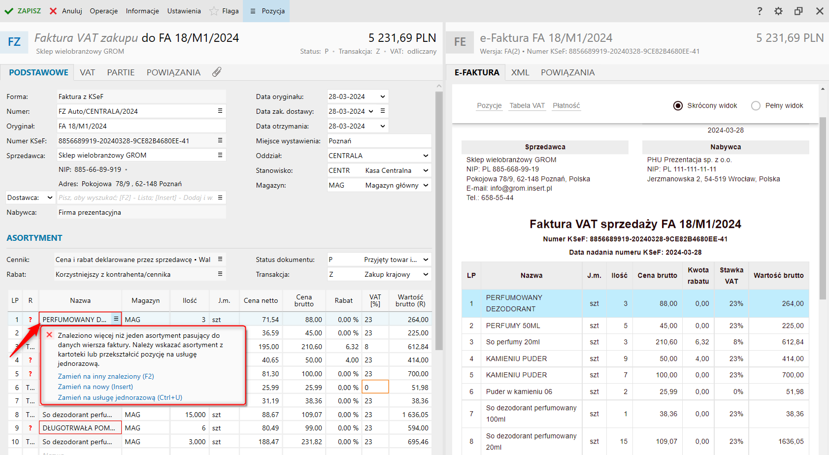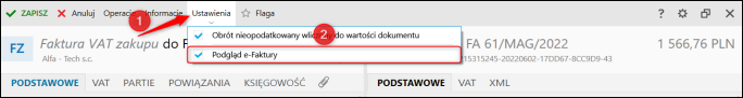 jeśli w tabelce asortymentu FZ zostanie wybrana jedna z pozycji, podgląd e-Faktury podświetli pasującą do niej pozycję;