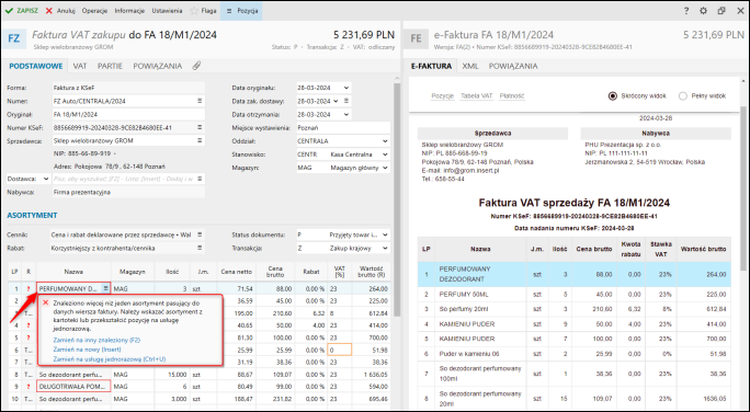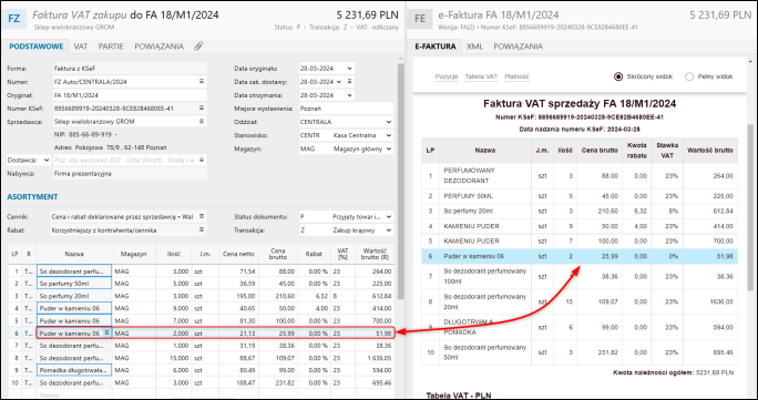 jeśli na zakładce VAT zostanie zaznaczona jedna z pozycji, na drugim dokumencie również zostanie ona podświetlona.