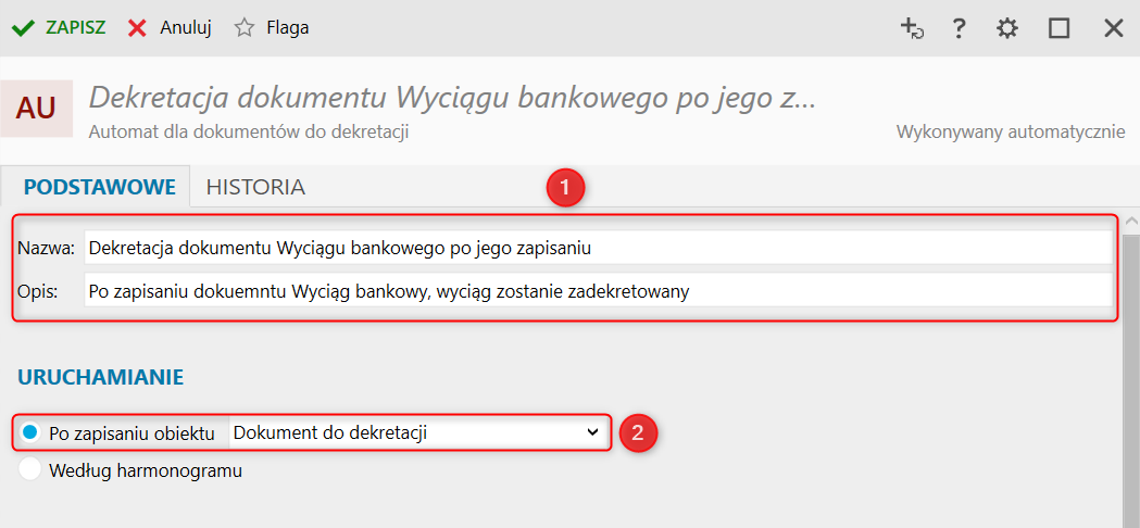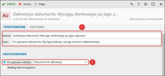 2. Nadać Nazwę automatu i zaznaczyć opcję uruchamiania Po zapisaniu obiektu - Dokument do dekretacji.