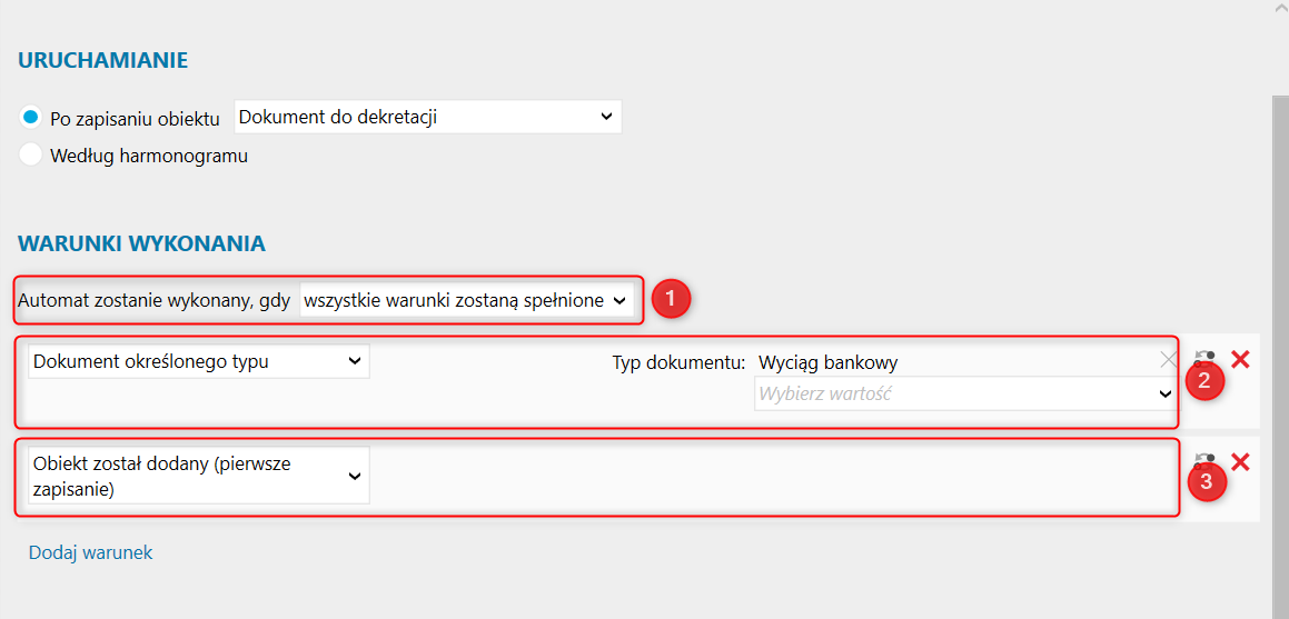 3.W sekcji Warunki wykonania wprowadzić dwa warunki wykonania. W pierwszym kroku w polu Automat zostanie wykonany, gdy – Wszystkie warunki zostaną spełnione. Następnie dodać dwa warunki: