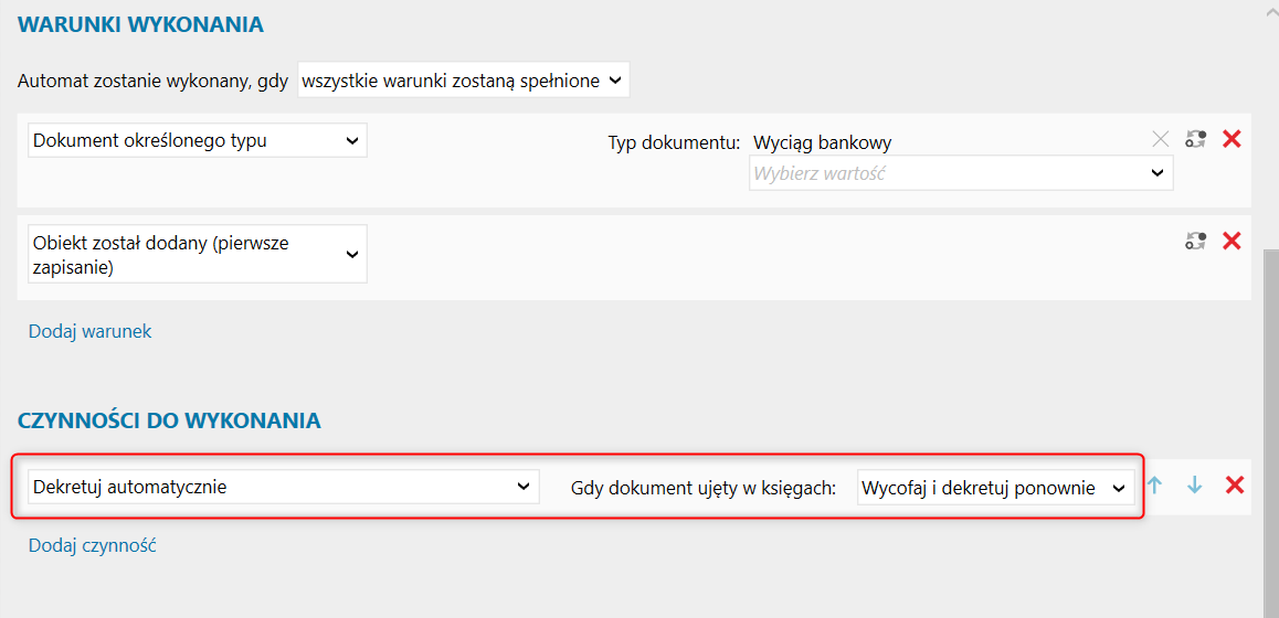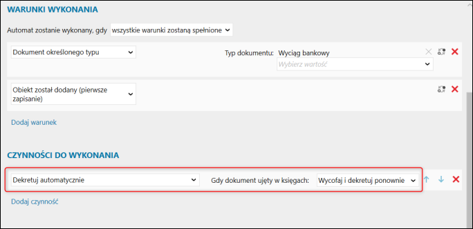 4. Jako Czynności do wykonania wprowadzić Dekretuj automatycznie oraz w polu Gdy dokument ujęty w księgach – Wycofaj i dekretuj ponownie