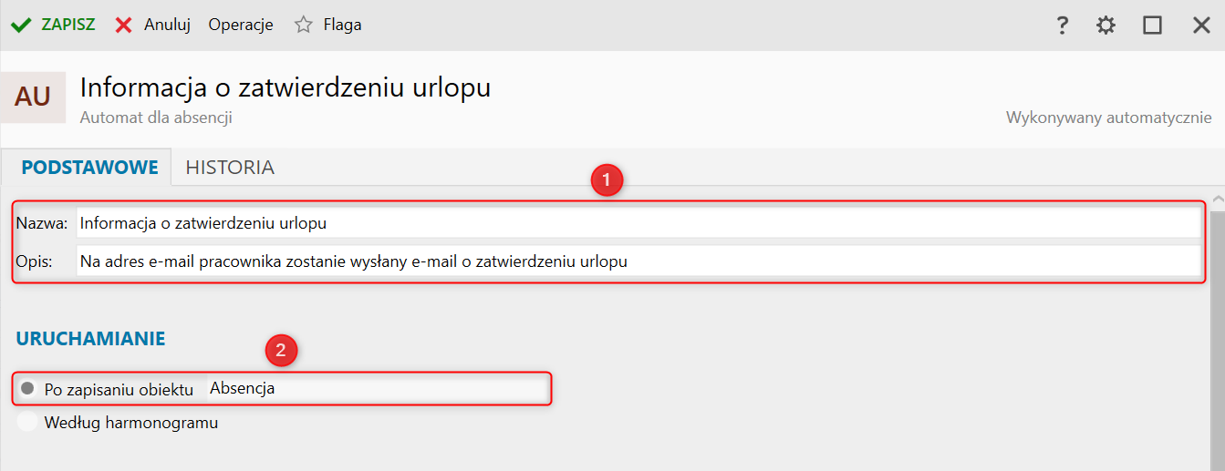 2. Nadać nazwę, opis automatu i wprowadzić moment uruchamiania obiektu Po zapisaniu obiektu – Absencja.