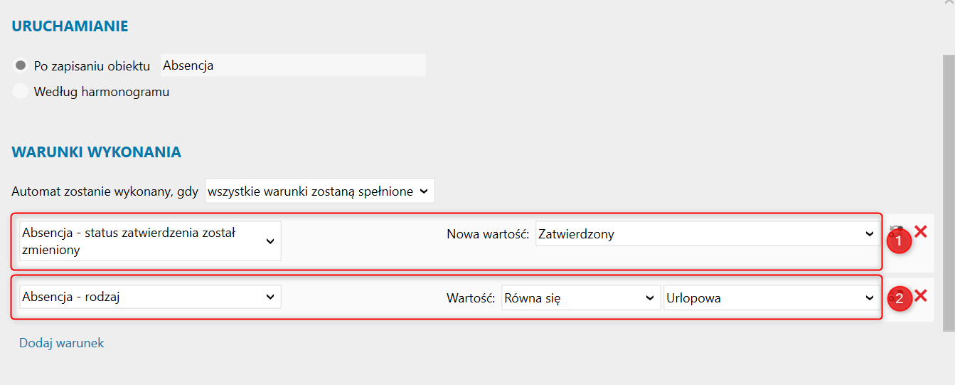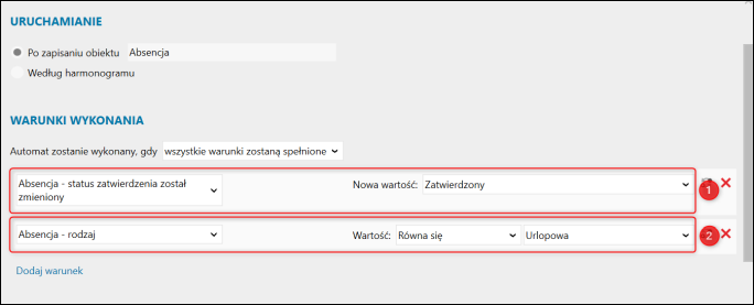 3. W sekcji Warunki wykonania wprowadzić dwa warunki wykonania. W pierwszym kroku w polu Automat zostanie wykonany, gdyWszystkie warunki zostaną spełnione. Następnie dodać dwa warunki: