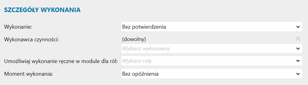 5. W sekcji Szczegóły wykonania wprowadzić ustawienia dotyczące sposobu wykonania, wykonawcy czynności i momentu wykonania automatu. Opcjonalnie umożliwić wykonywanie ręczne w module dla ról​Zapisać automat.