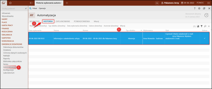 6. Po wykonaniu automatu, w module Automatyzacja na zakładce Historia pojawi się lista wszystkich wykonanych automatów wraz z wynikiem wykonanej operacji.