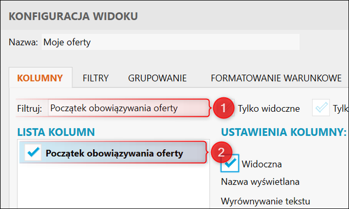 2. Na zakładce Kolumny w polu Filtruj wpisać Początek obowiązywania oferty, zaznaczyć wyszukaną kolumnę na liście, a zmiany zatwierdzić przyciskiem OK.