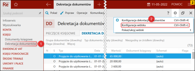 1. Przejść na zakładkę Dekretacji dokumentów, rozwinąć menu koła zębatego w górnym menu i wybrać Konfiguracja widoku.