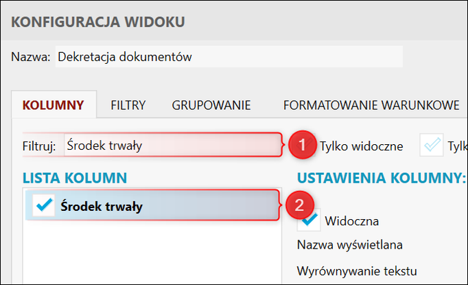 2. Na zakładce Kolumny w polu Filtruj wpisać Środek trwały, zaznaczyć wyszukaną kolumnę na liście, a zmiany zatwierdzić przyciskiem OK.