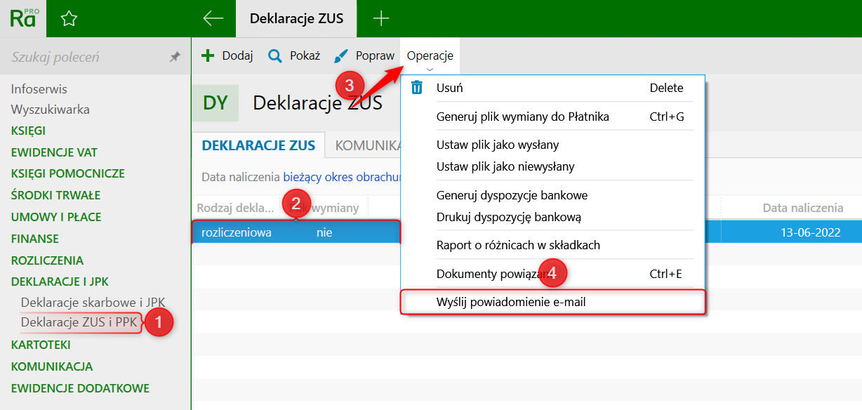 Programy Rachmistrz i Rewizor nexo umożliwiają wysłanie do wspólników firmy wiadomość e-mail z informacją o naliczonych składkach i terminie zapłaty. Aby to zrobić, należy przejść do modułu Deklaracje ZUS i PPK, zaznaczyć odpowiednią deklarację, następnie kliknąć górne menu Operacje – Wyślij powiadomienie e-mail.