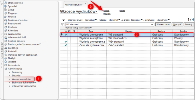 Aby dodać adres dostawy na wydruk dokumentu WZ, należy przejść do modułu Wzorce wydruków i powielić standardowy lub poprawić wzorzec własny.
