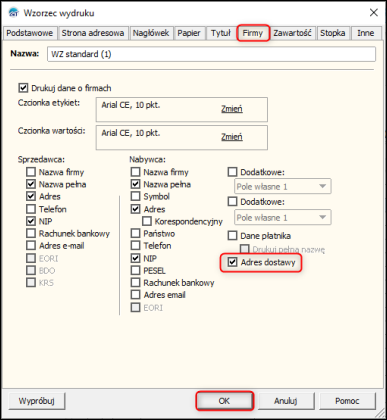 ​Zaznaczyć na zakładce Firmy opcję Adres dostawy. Zmiany zatwierdzić przyciskiem OK.