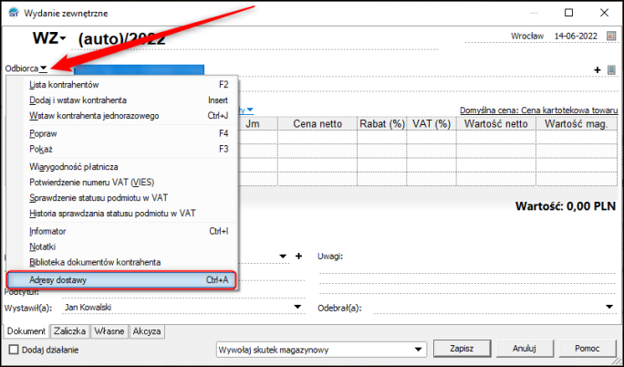 Subiekt GT – Jak dodać/wybrać inny adres dostawy na dokumencie WZ?