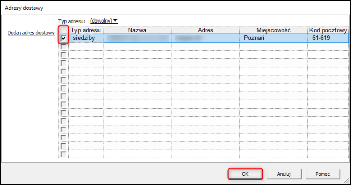Adres dostawy należy zaznaczyć na liście w omawianym oknie, aby pojawił się na dostosowanym wzorcu wydruku.