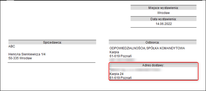 Rezultatem powyższych czynności będzie informacja o wybranym adresie dostawy na wydruku dokumentu.