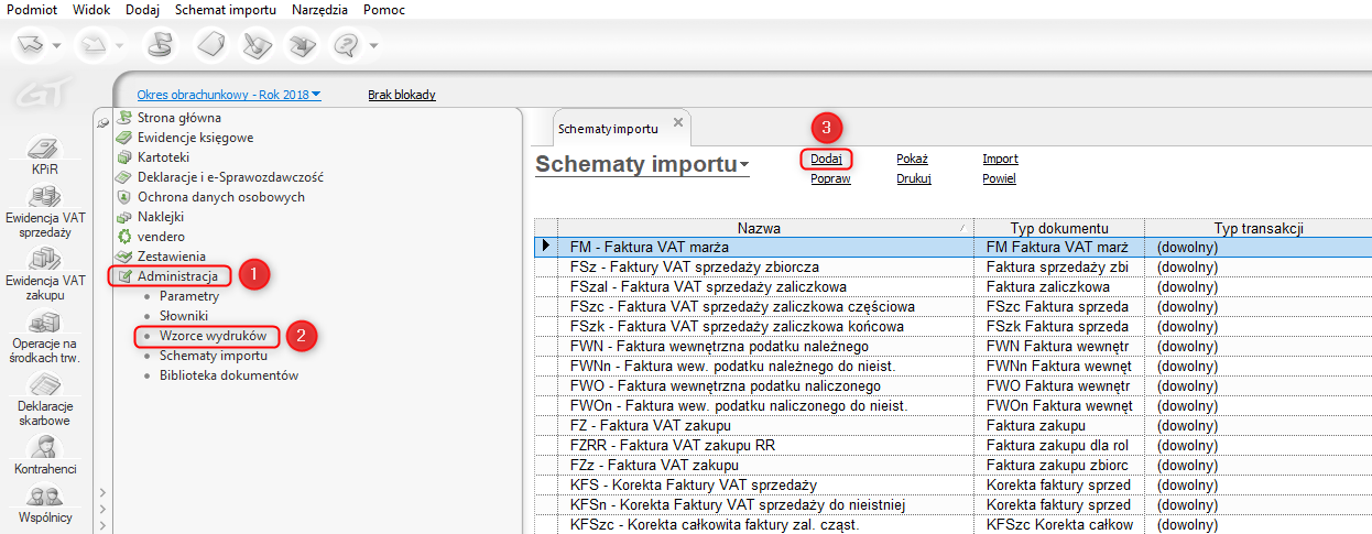 1. Z listy modułów wybrać Administracja – Schematy importu, a następnie kliknąć przycisk Dodaj.