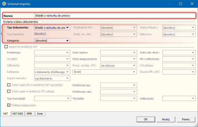 2. W oknie, które się wyświetli określić Nazwę schematu i jego kryteria wyboru dokumentów. Kryteriami wyboru dokumentów są właściwości dokumentu, po których dokument będzie automatycznie księgowany/ewidencjonowany w KPiR i Ewidencji VAT. Kryteria do określenia to: