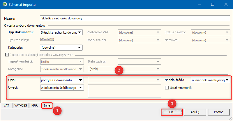 4. Następnym krokiem jest przejście na zakładkę Inne i określenie, co z dokumentu ma się zaimportować w pola Opis i Uwagi. Po wykonaniu wszystkich czynności schemat zapisać klikając przycisk OK.