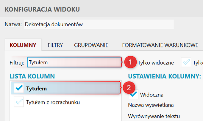 2. Na zakładce Kolumny w polu Filtruj wpisać Tytułem, zaznaczyć wyszukaną kolumnę na liście, a zmiany zatwierdzić przyciskiem OK.
