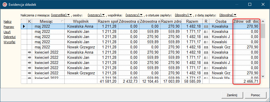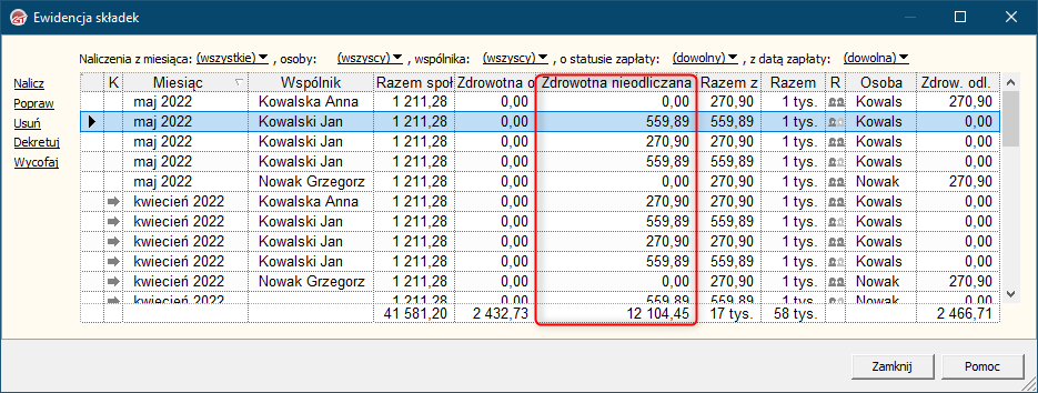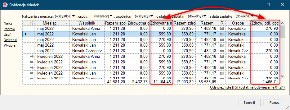 W związku z tym, dodana została nowa kolumna Zdrowotna odliczana od dochodu, która prezentuje wartość składki możliwej do odliczenia lub ujęcia w kosztach. Dotychczasowe kolumny Zdrowotna 1 i Zdrowotna 2 otrzymały nazwy: Zdrowotna odliczana od podatku i Zdrowotna nieodliczana.