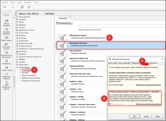 Aby włączyć program diagnostyki i polepszenia jakości programów, należy przejść do modułu Parametry, otworzyć Aktualizacje biznesowe i na zakładce Telemetria zaznaczyć Wyrażam zgodę pod polem Program potrzeb i preferencji użytkowników.