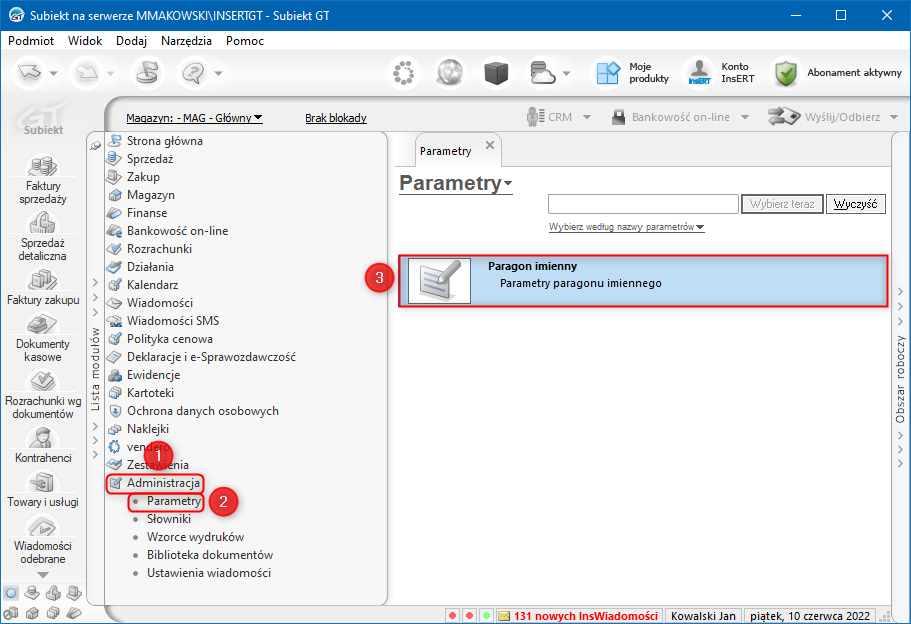 1. Z listy modułów wybrać Administracja – Parametry, a z listy parametrów Paragon imienny.