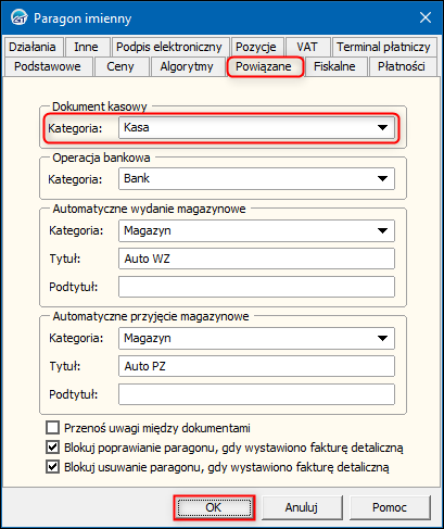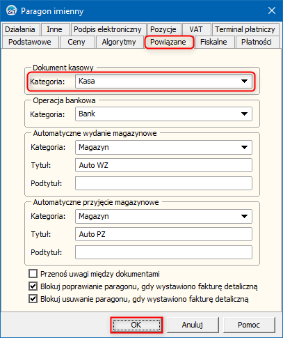 2. W oknie, które się wyświetli przejść na zakładkę Powiązane i wybrać domyślną Kategorię w sekcji Dokument kasowy. Zmiany zapisać przyciskiem OK.
