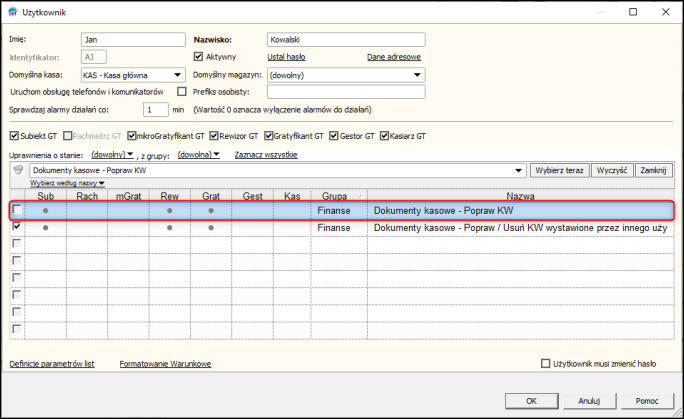 3. Na liście uprawnień odznaczyć pozycję o nazwie Dokumenty kasowe - Popraw KW. Aby zapisać zmiany, należy wybrać OK.