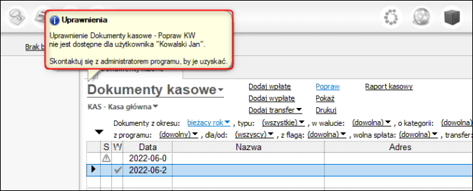 Rezultatem odebrania uprawnień będzie blokada możliwości poprawiania dokumentów KW potwierdzona odpowiednim komunikatem.