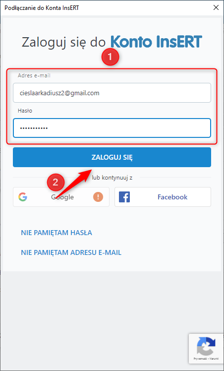 7. W nowo ukazanym oknie wprowadzić dane dostępowe Konta InsERT i kliknąć przycisk zaloguj się.