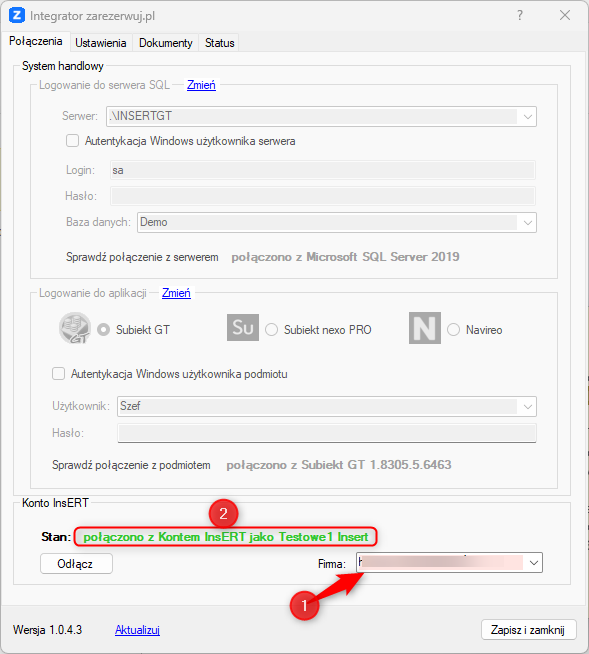8. W przypadku jeśli do konta InsERT, podłączonych jest więcej niż jedna firma, wybrać odpowiednią z rozwijanej listy. Po pomyślnym podłączeniu Konta InsERT zmieni się status podłączenia.