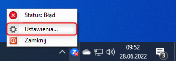 2. Następnie na pasku zadań systemu, odnaleźć ikonę integratora, kliknąć ikonę prawym przyciskiem myszy i wybrać Ustawienia.