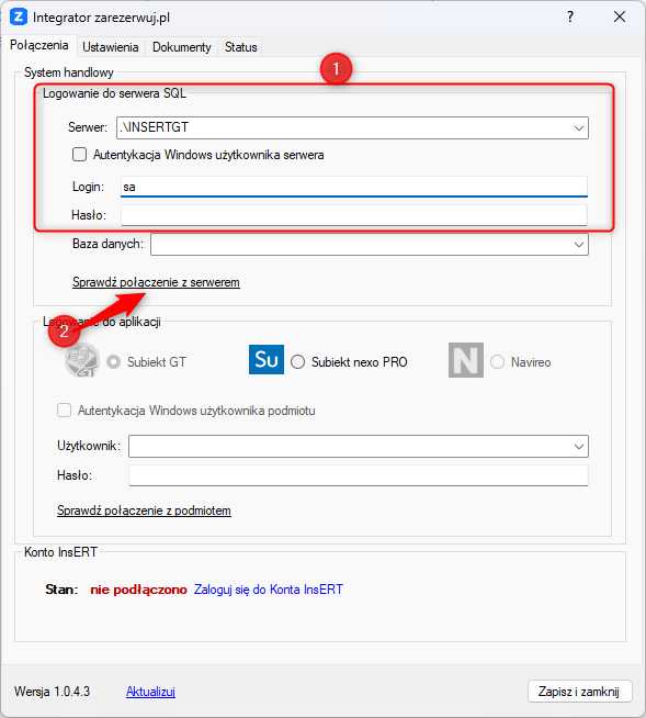 3. W pierwszej sekcji należy uzupełnić dane dostępowe do serwera SQL na, którym znajduje się baza danych systemu Subiekt GT. W przypadku pracy lokalnej (gdy Subiekt GT został zainstalowany przy standardowych ustawieniach instalatora) będzie to adres (local)\INSERTGT. Następnie kliknąć Przycisk sprawdź połączenie z serwerem.
