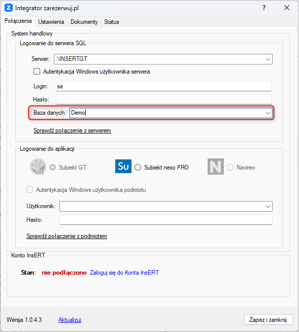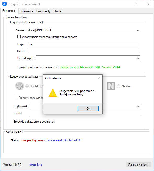 Do poprawnego działania należy określić parametry połączenia z bazą danych systemu Subiekt GT oraz podać dane dostępowe Konta InsERT, na którym znajduje się licencja zarezerwuj.pl. W tym celu należy: