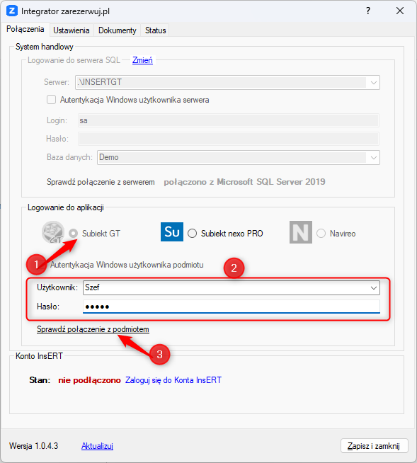 5. Sekcji Logowanie do aplikacji, wybrać Subiekt GT i uzupełnić dane dostępowe użytkownika Subiekta GT z uprawnieniami Szefa. Następnie kliknąć przycisk Sprawdź połączenie z podmiotem.