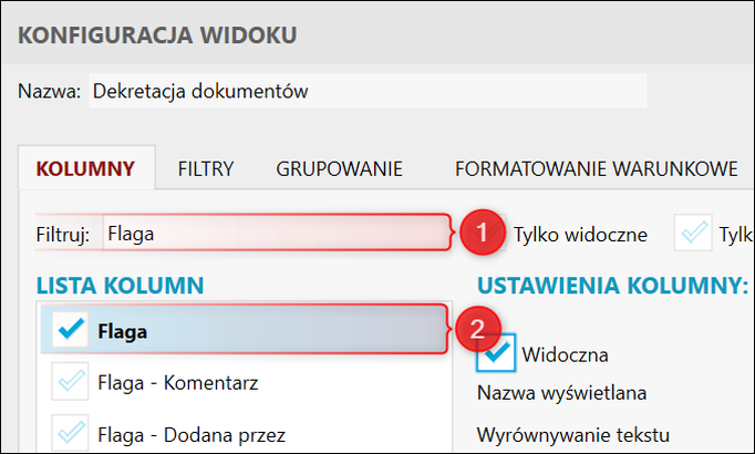 2. Na zakładce Kolumny w polu Filtruj wpisać Flaga, zaznaczyć wyszukaną kolumnę na liście, a zmiany zatwierdzić przyciskiem OK.