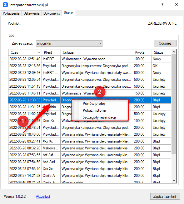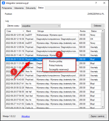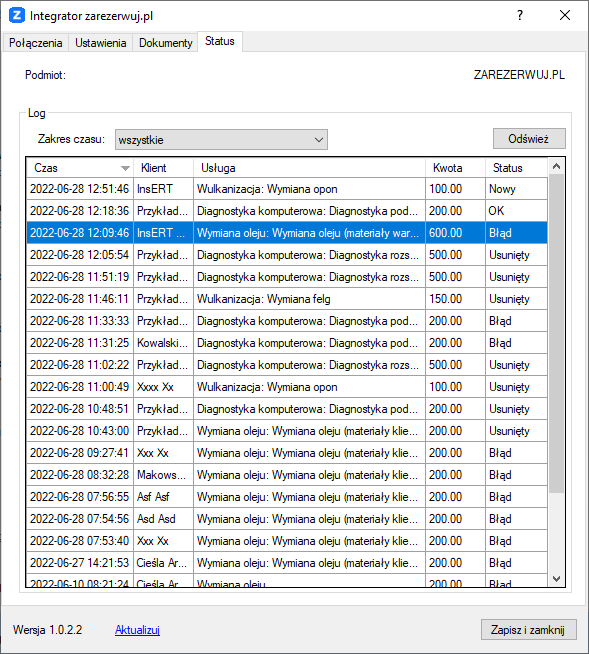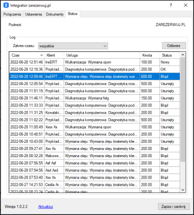 Dodatkowo w zakładce Status znajdują się informacje, dotyczące synchronizacji dokumentów z aplikacji zarezerwuj.pl.