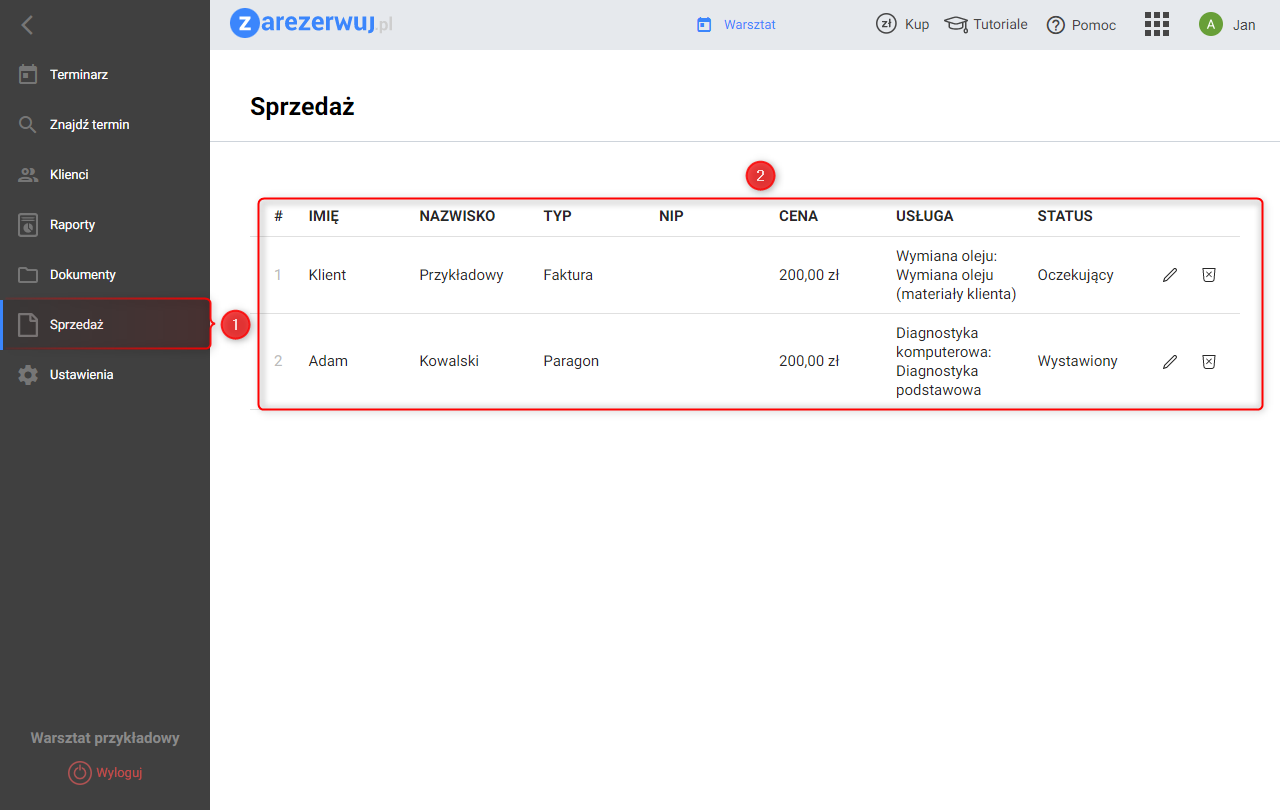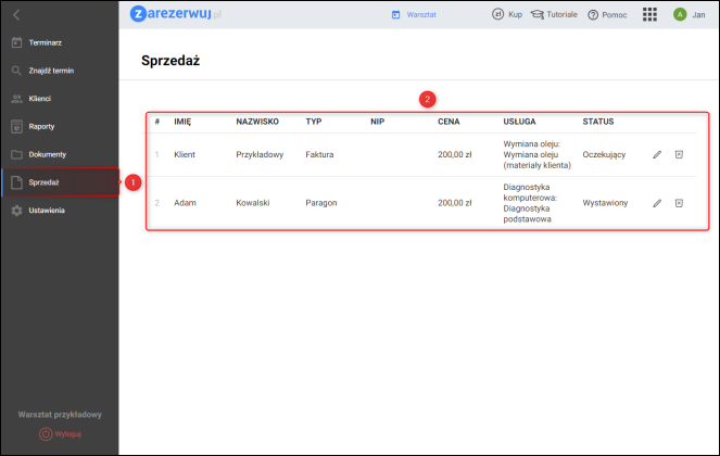 Użytkownik także ma możliwość uzyskania podobnych informacji, po stronie aplikacji zarezerwuj.pl. W tym celu należy, przejść do modułu sprzedaż. W tym miejscu znajduje się lista dokumentów wraz z ich statusem realizacji.
