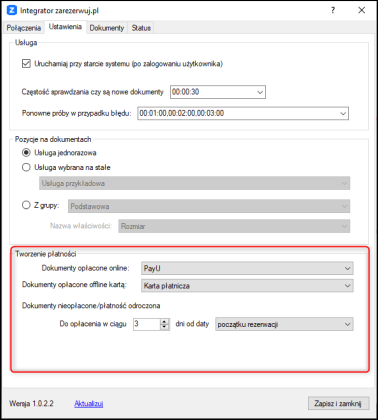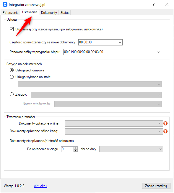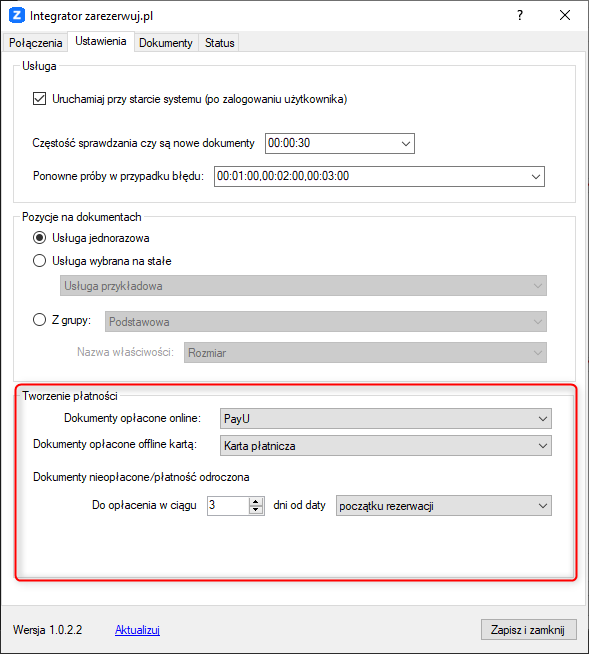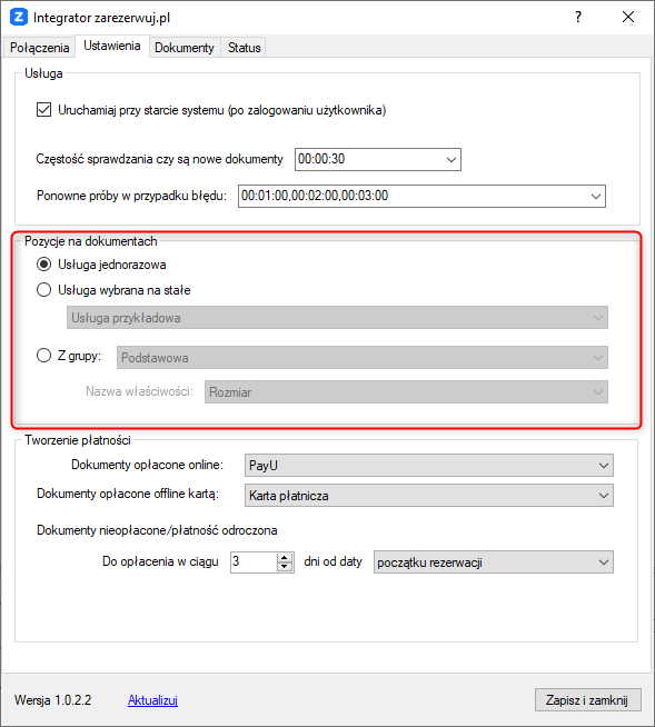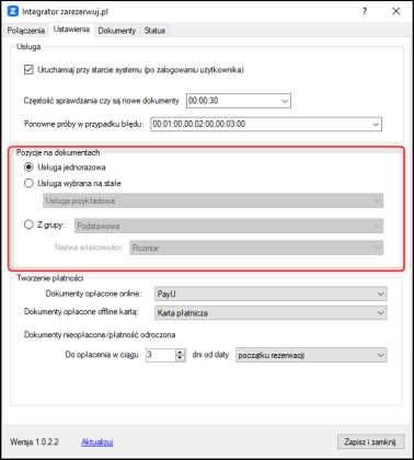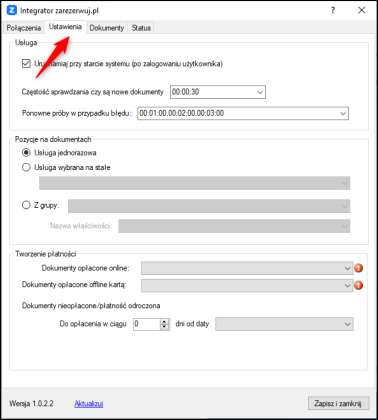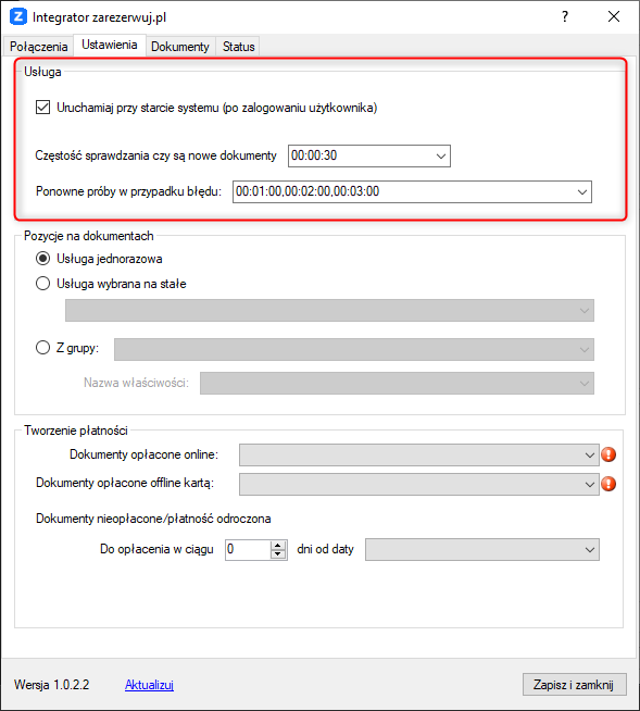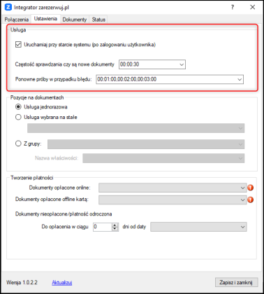 2. W sekcji Usługa określić czy Integrator zarezerwuj.pl, ma być uruchamiany podczas startu systemu operacyjnego. Następnie określić, częstość, z jaką integrator ma sprawdzać, nowe dokumenty w aplikacji zarezerwuj.pl. Wskazać, w jaki sposób Integrator zarezerwuj.pl, ma się zachowywać w przypadku błędu synchronizacji. Do wyboru są 2 opcje: