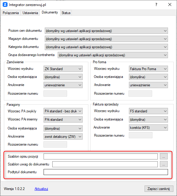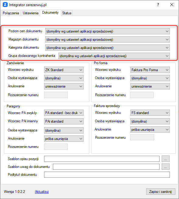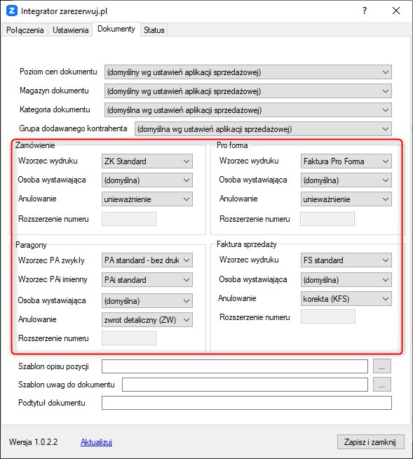 6. Następnie dla poszczególnych typów dokumentów ustalić wzorce wydruków, wskazać osobę wystawiającą dokument oraz określić, w jaki sposób integrator ma postępować z wystawionym dokumentem w przypadku anulowania rezerwacji. Dodatkowo użytkownik może ustalić rozszerzenie numeru, dla dokumentów związanych z aplikacją zarezerwuj.pl.