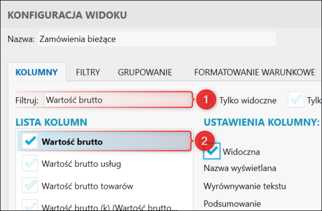 2. Na zakładce Kolumny w polu Filtruj wpisać Wartość brutto, zaznaczyć wyszukaną kolumnę na liście, a zmiany zatwierdzić przyciskiem OK.